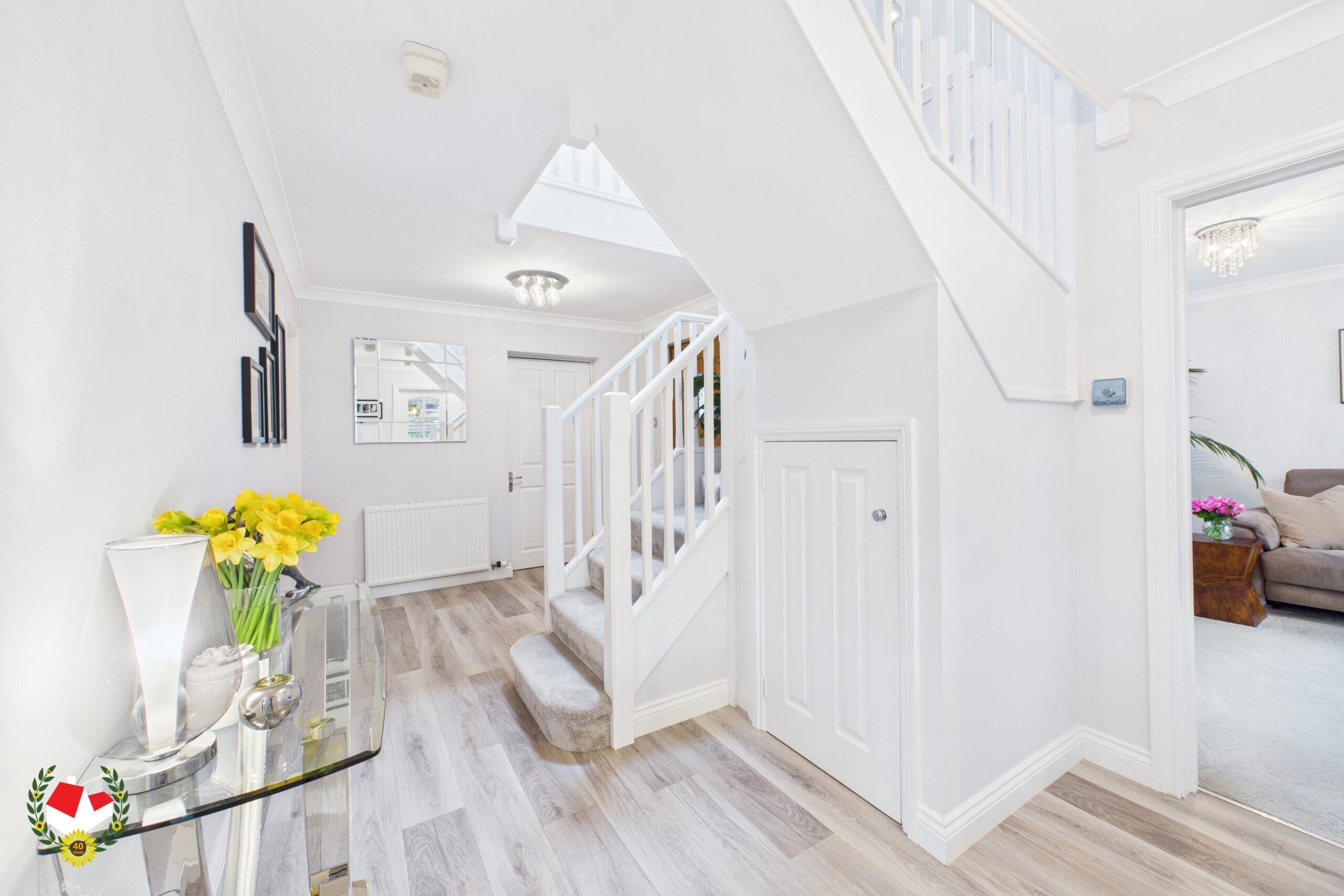 To the first floor, the landing leads to four well-proportioned double bedrooms, including a primary bedroom with en-suite shower room, along with a stylish four-piece family bathroom.